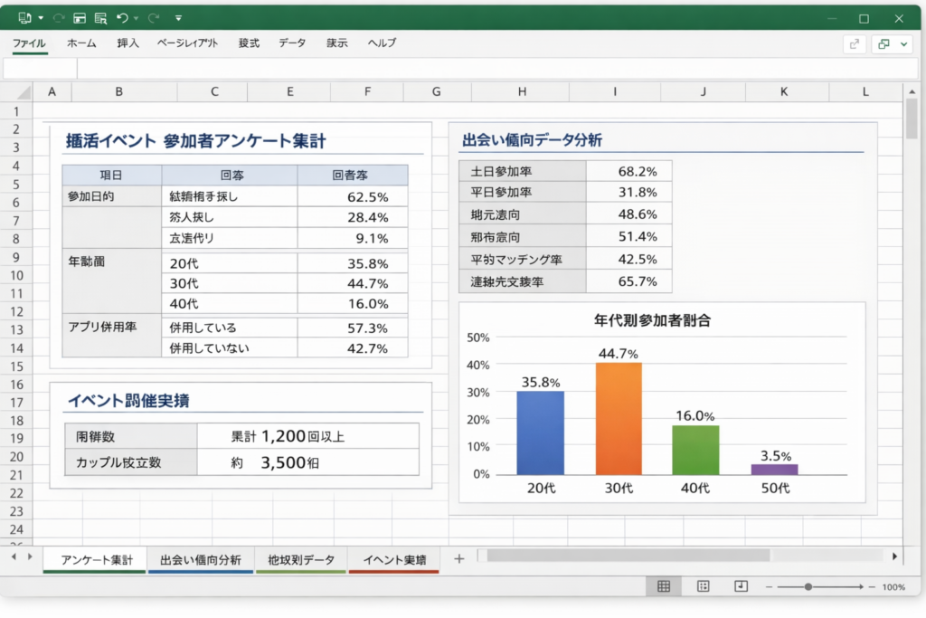 実際の開催データや参加者アンケートをもとに、イベント内容や出会い傾向の分析を継続しています。
