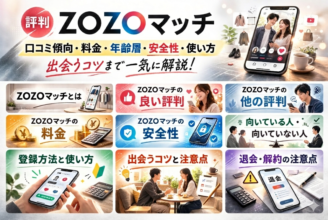 ZOZOマッチの評判が気になるけど、「本当に出会える?」「料金は?」「安全?」で止まっていませんか。ZOZOマッチは、条件検索でガツガツ探すというより、全身の雰囲気とファッションの好みから“おすすめ”が届くタイプ。だからこそ、合う人にはテンポよく進む一方で、地域やタイミング次第で物足りなさを感じることもあります。この記事では、良い口コミ・悪い口コミの傾向、男性料金とオプション、年齢層、身バレ対策、登録〜出会うまでのコツまで、迷いが消えるように具体的にまとめました。ぜひ参考にしてサービスを利用してみてくださいね♪